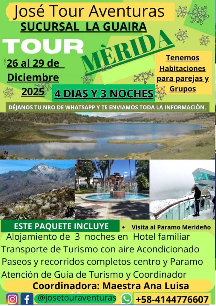 25-12-25 Salida 9: 00 pm (Desde Catia la Mar y pasaremos por los puntos Encrucijada, Maracay, Valencia… para recoger los pasajeros en esa vía) Viajaremos toda la noche y llegar a Merida en la mañana.